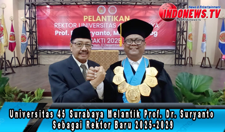 Surabaya, indonews.tv – Bertempat di lantai 3 Gedung Juang 45 Surabaya Jl Mayjend Sungkono Surabaya, secara resmi Universitas 45 Surabaya memiliki Rektor baru, iyalah Prof. Dr. Suryanto, M.Si., Psikologi sebagai rektor baru Universitas 45 Surabaya, pengukuhan acara tersebut diadakan pada hari Rabu 17/12/2025, Suryangto yang akan memimpin Universitas 45 Surabaya selama periode 2025–2029. Sebagai dosen di Universitas Airlangga (Unair), Prof. Suryanto diharapkan dapat meningkatkan daya saing Universitas 45 Surabaya di tengah perubahan dalam pendidikan tinggi di tingkat nasional.
